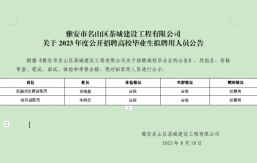 雅安市名山區(qū)茶城建設工程有限公司系雅安市名山區(qū)區(qū)屬一級國有企業(yè),成立于2018年10月,注冊資本金25000萬元,主要經營范圍為對土地、城市資源等領域及保障性住房、房地產開發(fā)、城市基礎設施、公共服務設施等進行經營管理;并開展項目投資、工程管理服務、園林綠化、環(huán)境治理工程、土地整理和各類工程建設活動等。根據公司2023年人員招聘計劃,茶城公司擬面向社會公開招聘3名工作人員。現(xiàn)將有關事項公告如下:一、報名條件(一)招錄崗位、名額及招錄資格條件(見附表)(二)基本條件1.本科及以上學歷、學士及以上學位。包括2023年應屆高校畢業(yè)生;2022年、2021年未參加工...