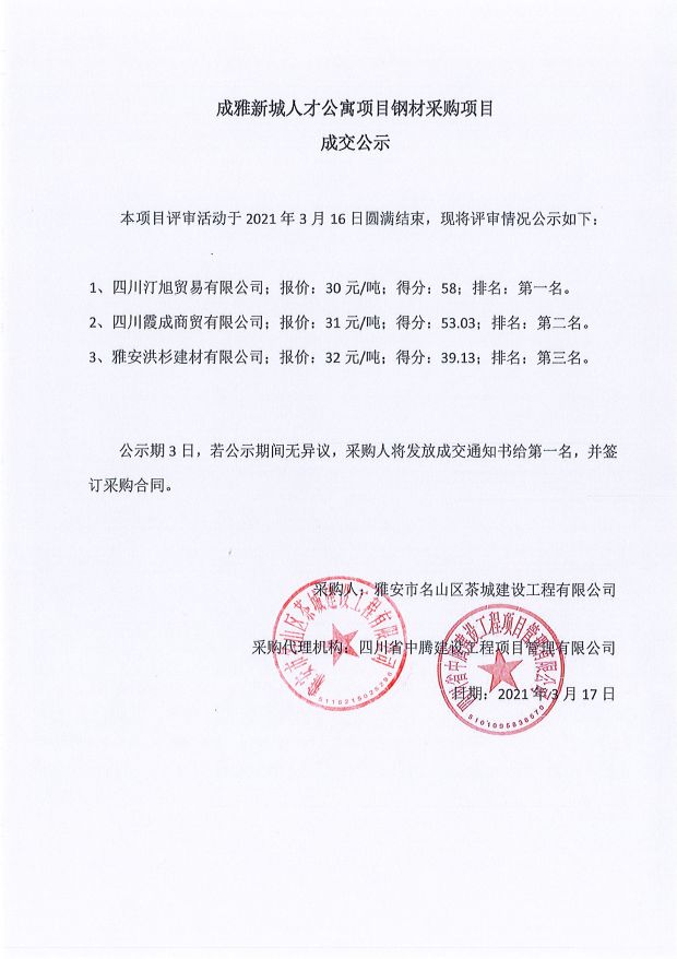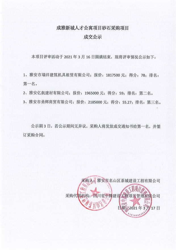 成雅新城人才公寓砂石、塔機(jī)租賃、土石方、鋼材、管架租賃、模板木方、水泥采購(gòu)項(xiàng)目成交公示